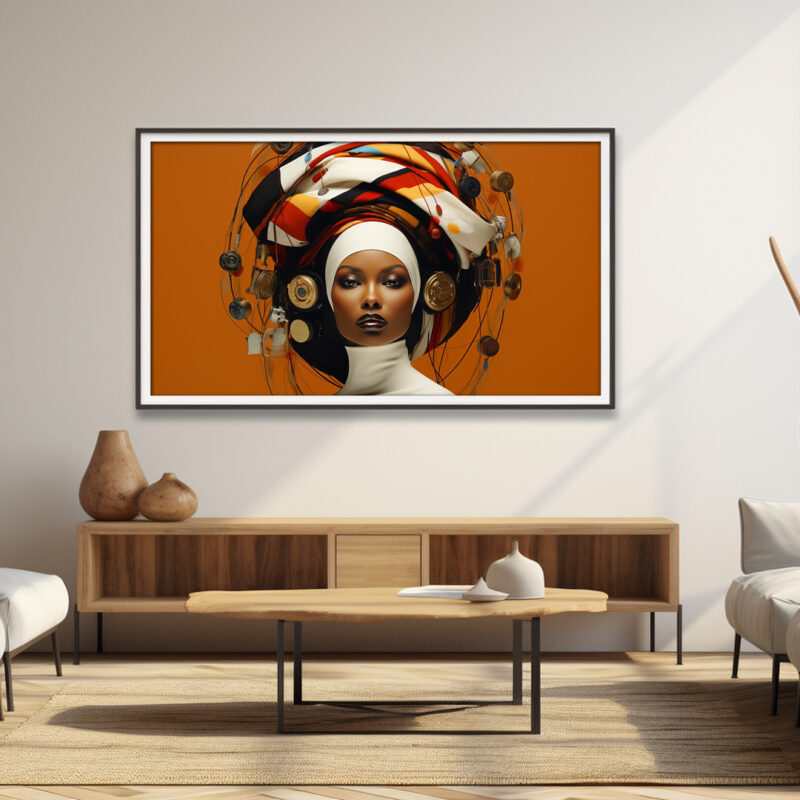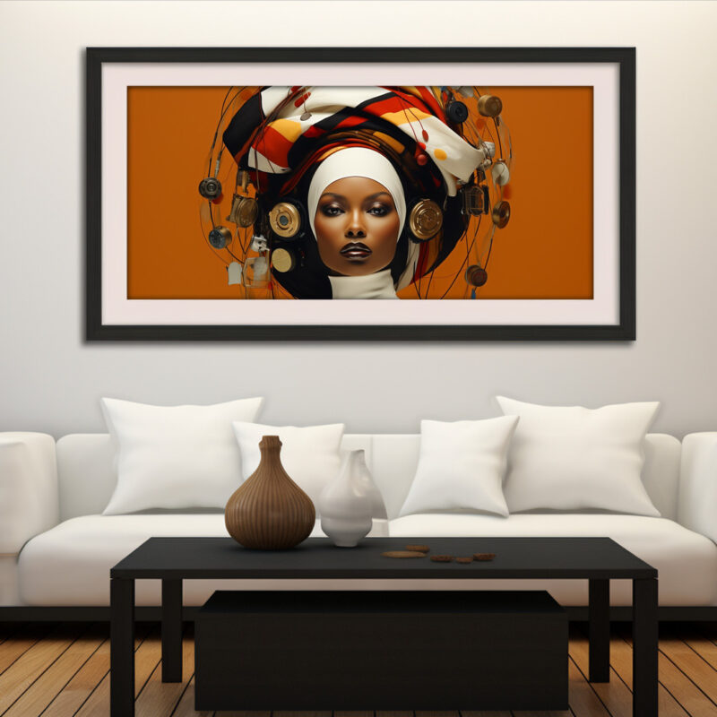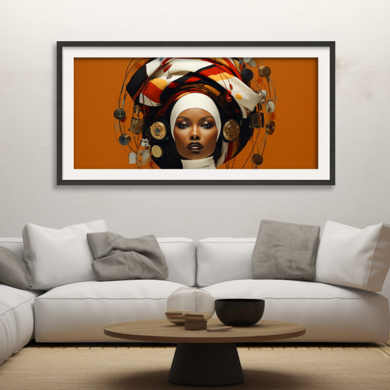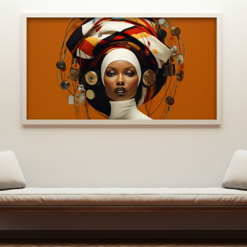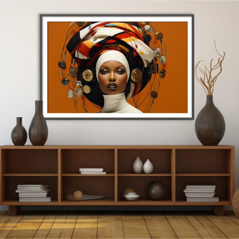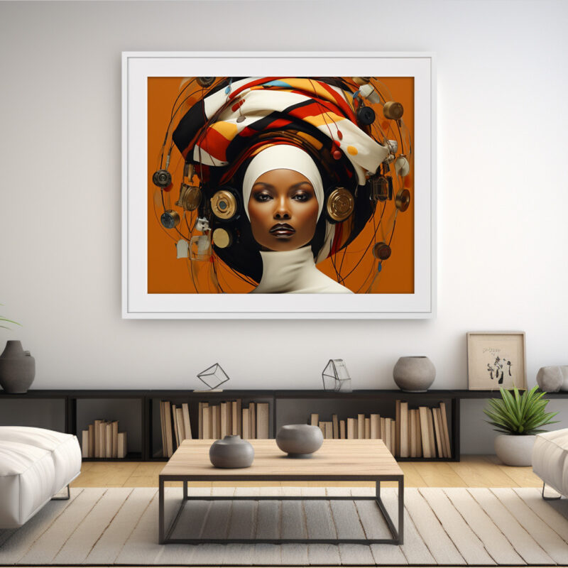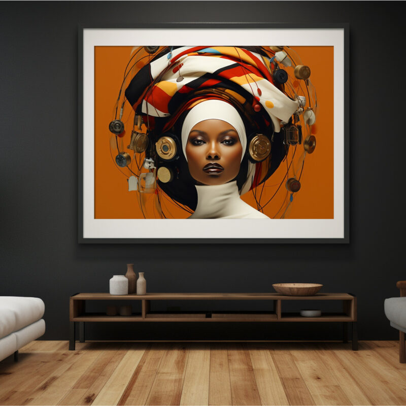 Afrofuturist digital art print Chronos Crown celebrates Black royalty in a mesmerizing blend of tradition and timekeeping. Wrapped in immaculate white fabric, the subject’s towering headpiece intertwines vibrant West-African-inspired textiles with vintage clocks, watch parts, and gleaming mechanical elements. Echoing both the elegance of Eartha Kitt’s turbans and the inventive runway drama of modern Afrofuturism, the piece declares that Black aesthetics are not just timeless—they define time itself.
