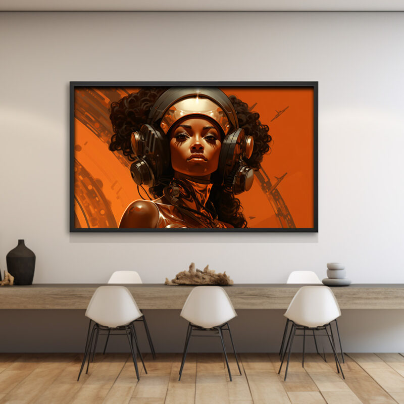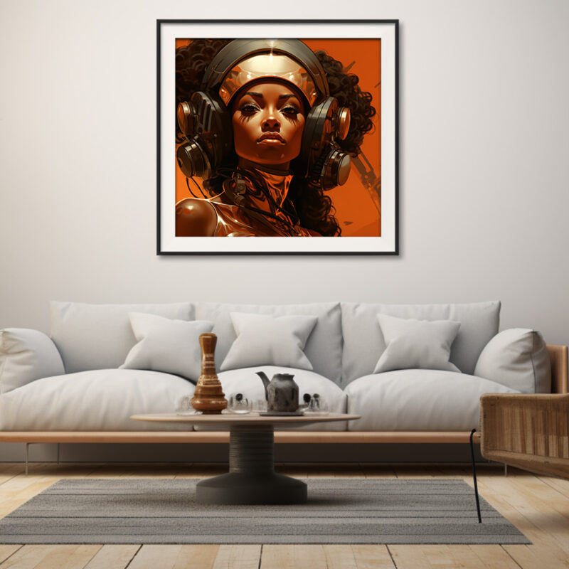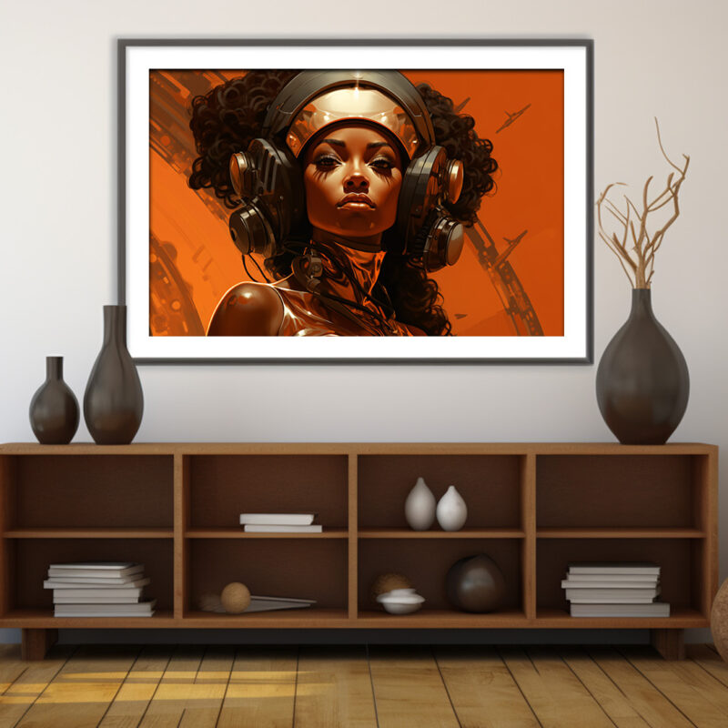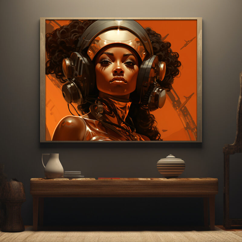 A futuristic portrait of a black woman with advanced technology integrated into her appearance. She has dark skin and voluminous curly hair, giving her an edgy and empowered look. Her head is encased in what seems to be a pair of metallic headphones audio interface.