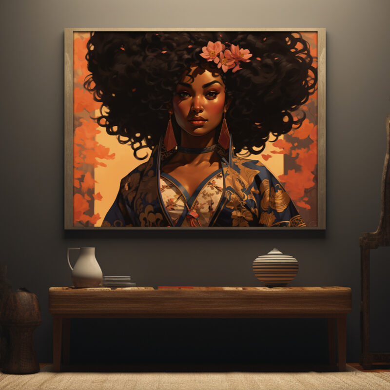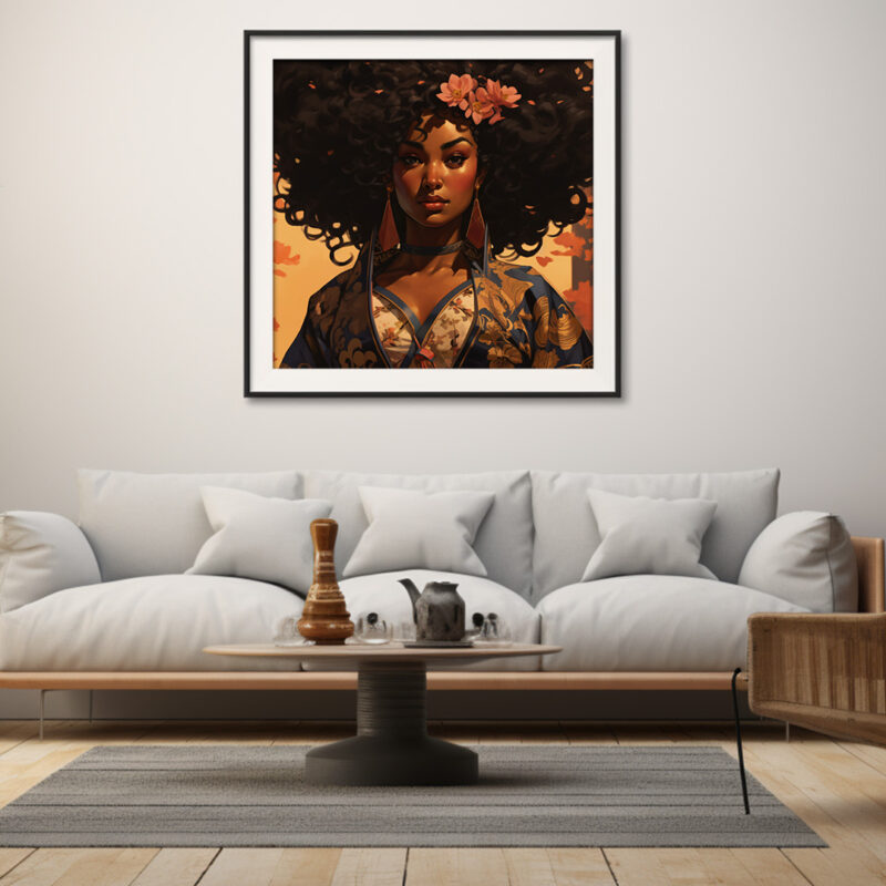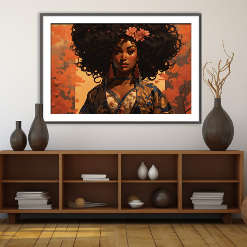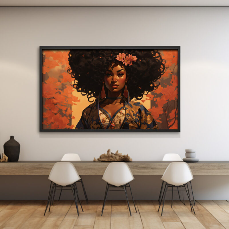 A vibrant digital illustration showcasing a woman with a large, voluminous afro hairstyle. A pink flower is elegantly placed in her hair, adding a touch of color and softness to her look. She is dressed in a blue and gold patterned garment that contrasts beautifully with her dark skin. The background is a warm orange, reminiscent of autumn leaves, which adds depth and a seasonal feel to the artwork.
