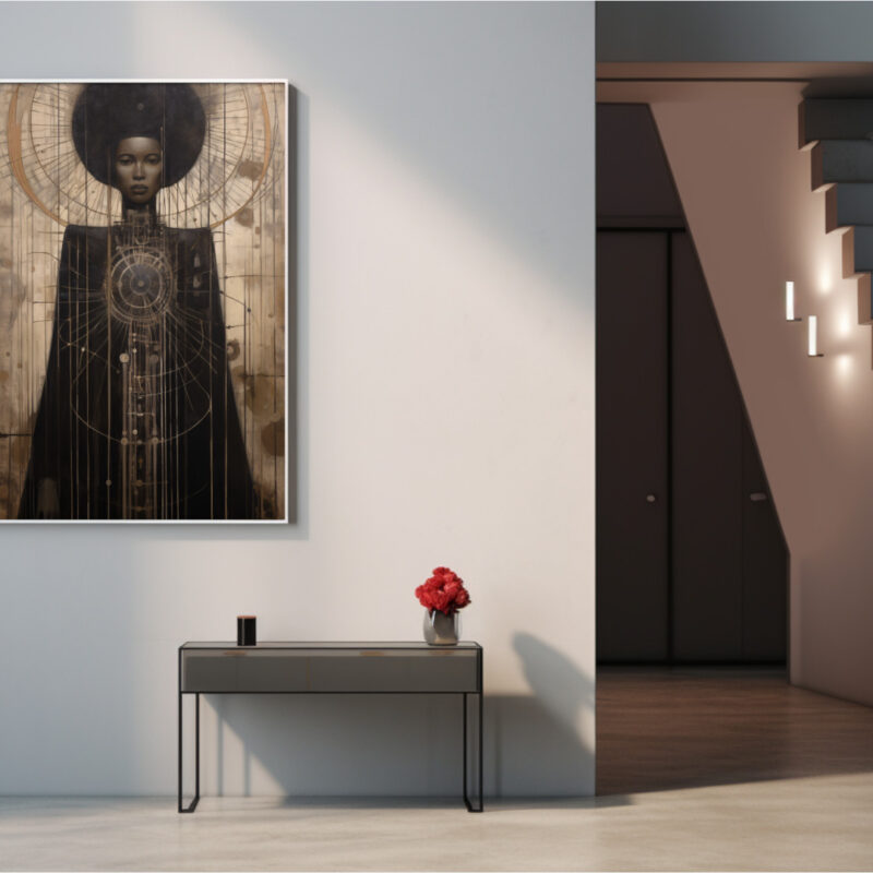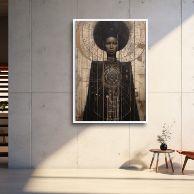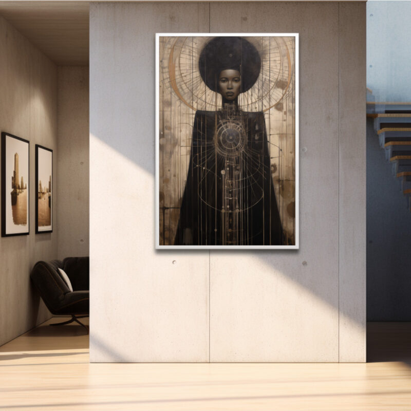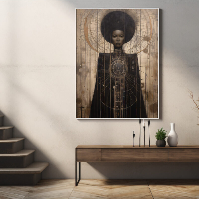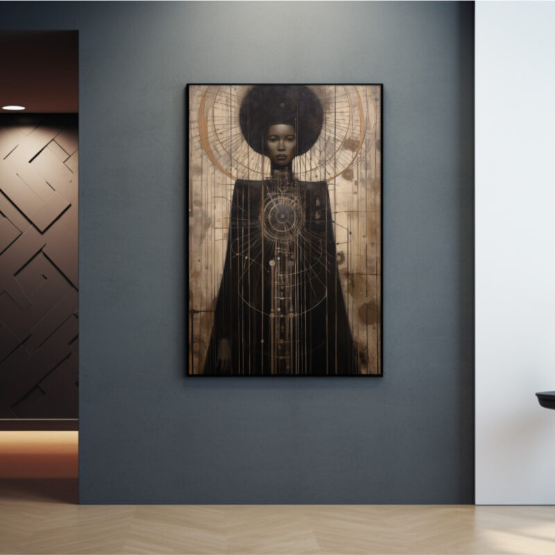 Astra-Majesty radiates regal stillness and cosmic intrigue. This Afrocentric digital portrait depicts a poised Black woman crowned by an ethereal halo of orbital lines. Brushed earth-gold textures meet deep ebony robes, expressing heritage and futurity in one frame—perfect for collectors of refined statement art.