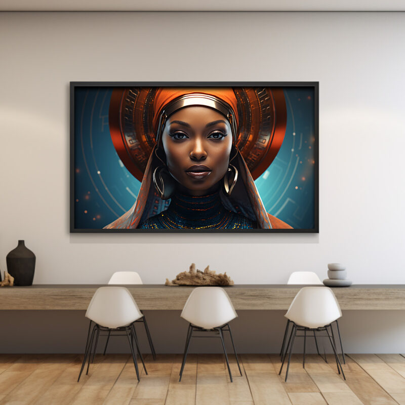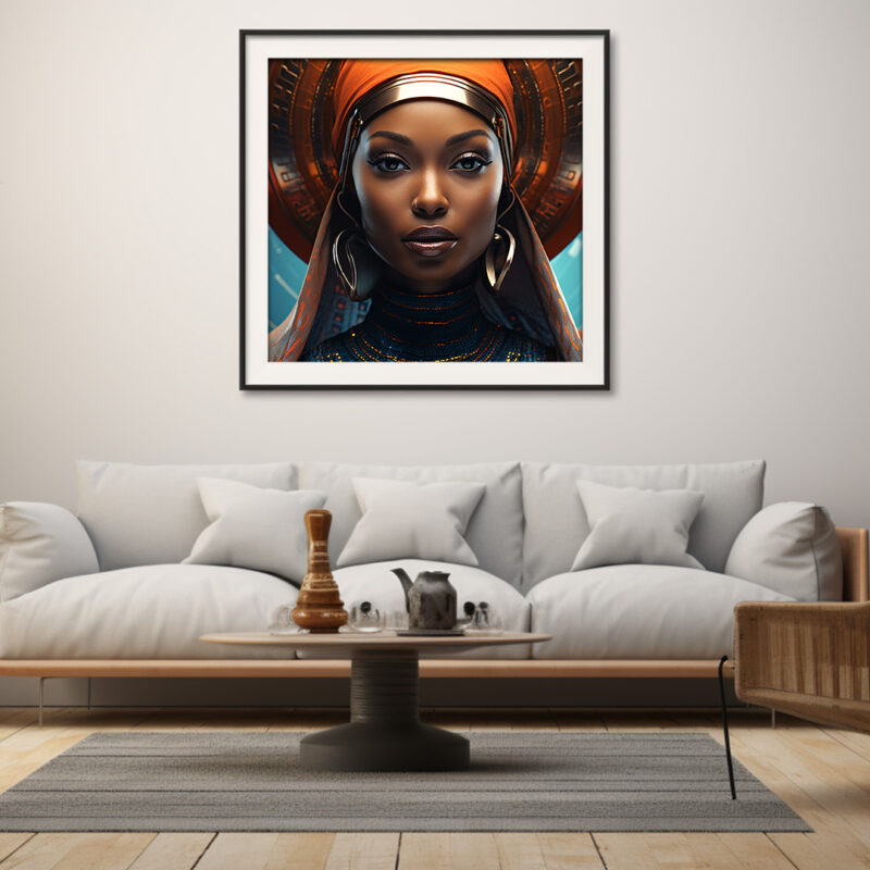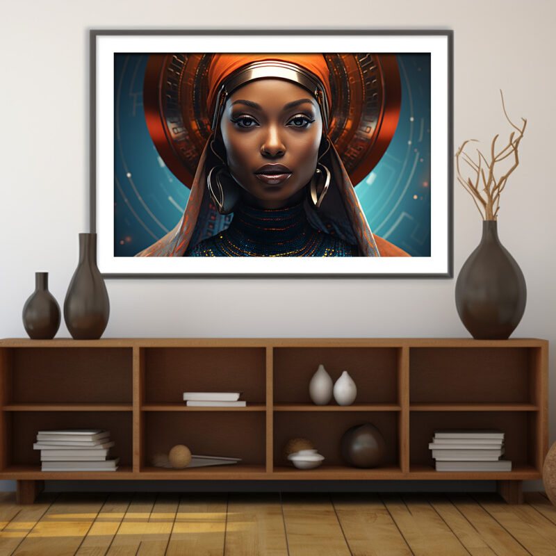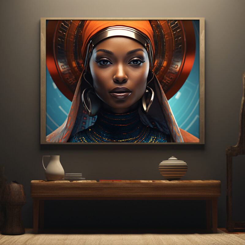 Delve into the realm of Afrofuturism with this captivating digital art portrait. Featuring a woman adorned with vibrant accessories, including gold earrings and an orange headwrap, she embodies both classic African beauty and futuristic style. The background is ablaze with the energy of futuristic technology, contrasting with the timelessness of her regal gaze. This artwork is a celebration of African culture’s influence in shaping tomorrow’s world.