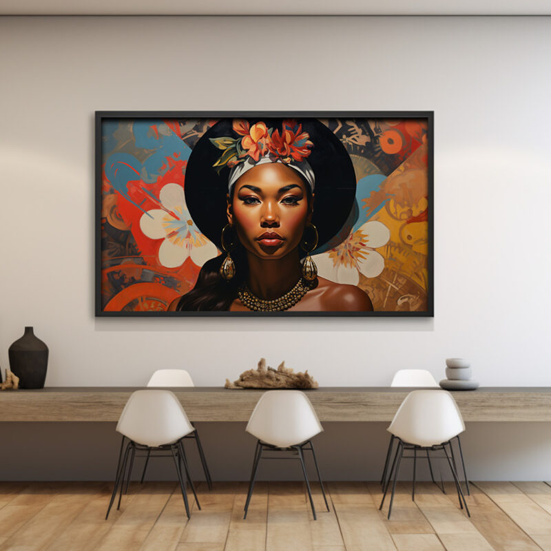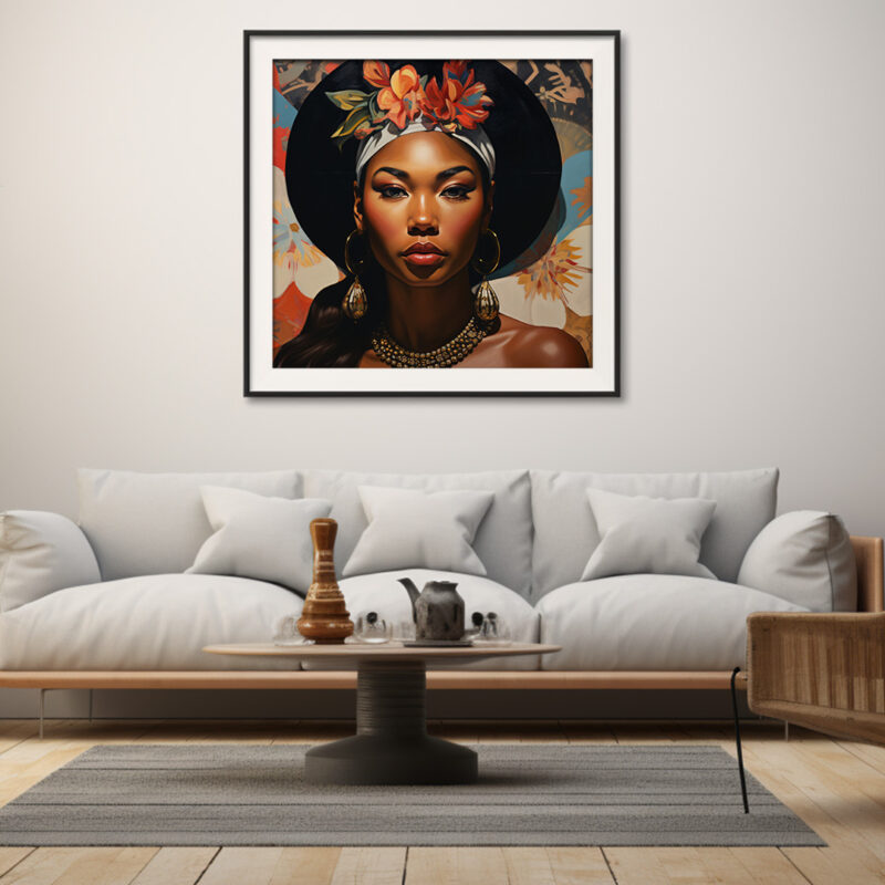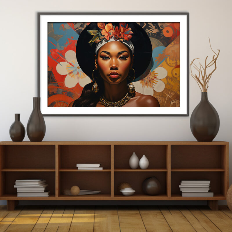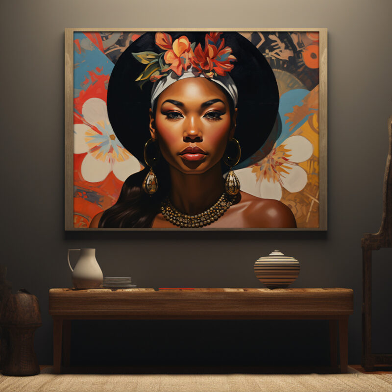 Elevate your digital art collection with this exquisite portrait that beautifully captures the essence of Afrocentric art. The central figure is a woman with a radiant smile, her face framed by a crown of flowers in a riot of colors that add a touch of nature’s vibrancy to the piece. She is also wearing a statement necklace that adds a layer of sophistication to her look.