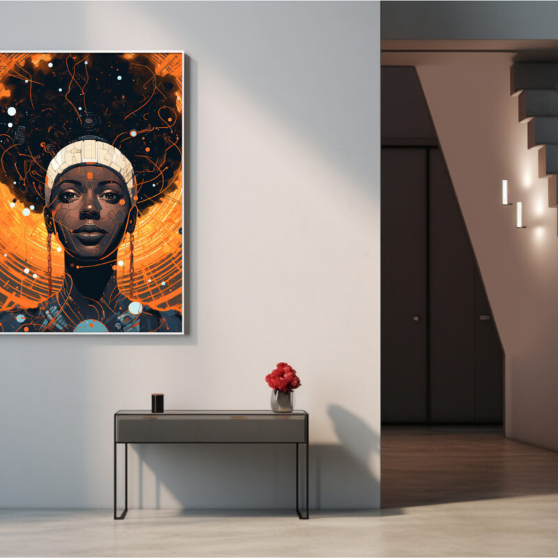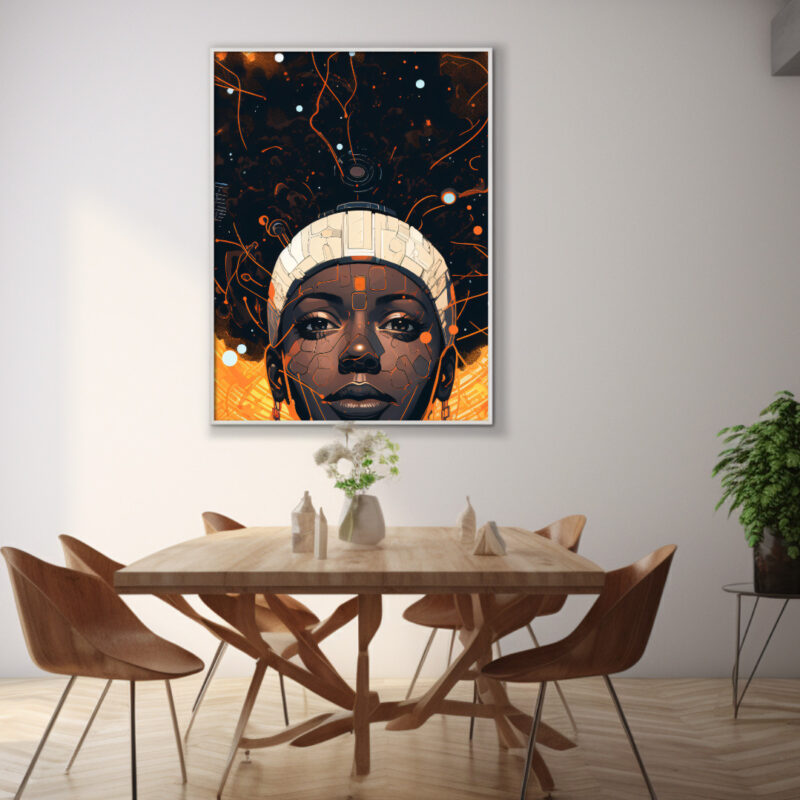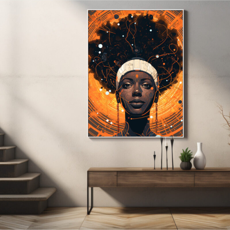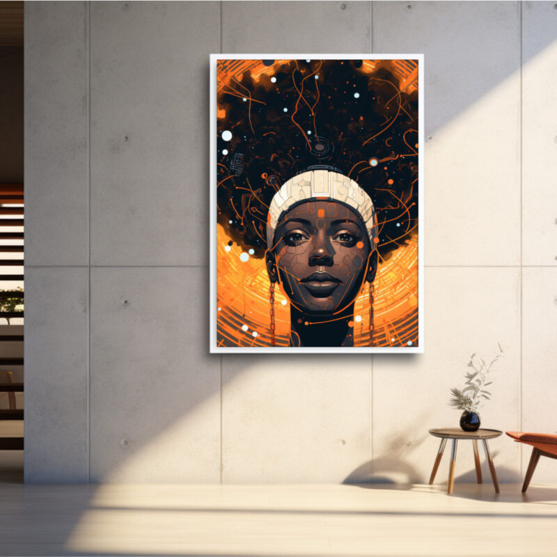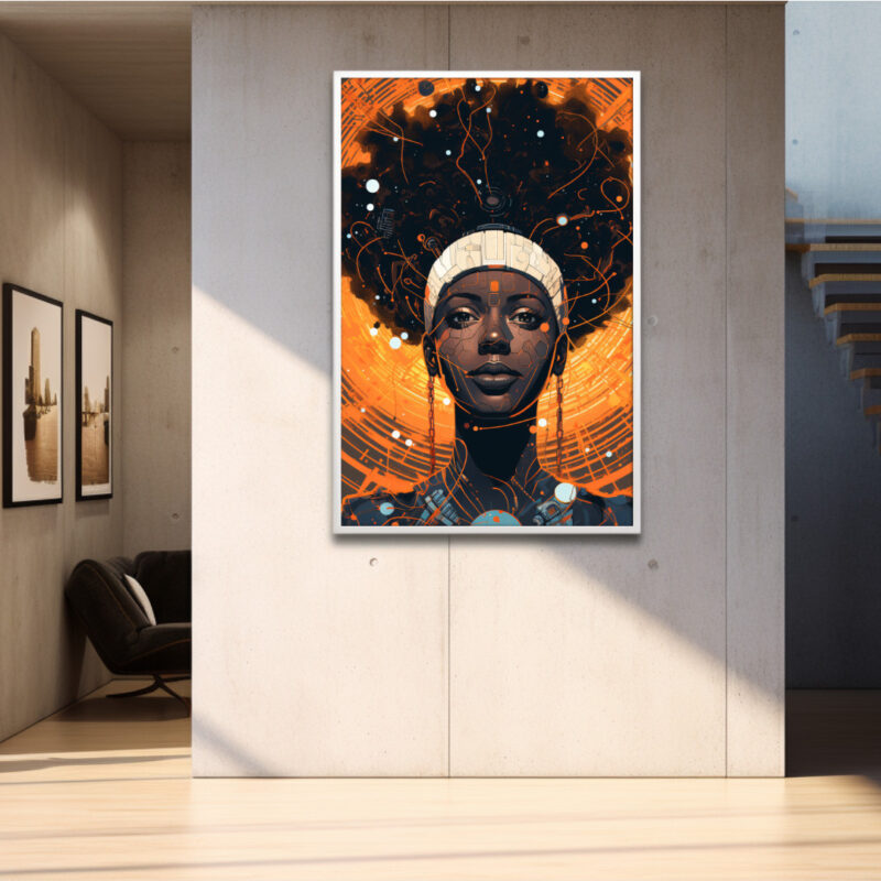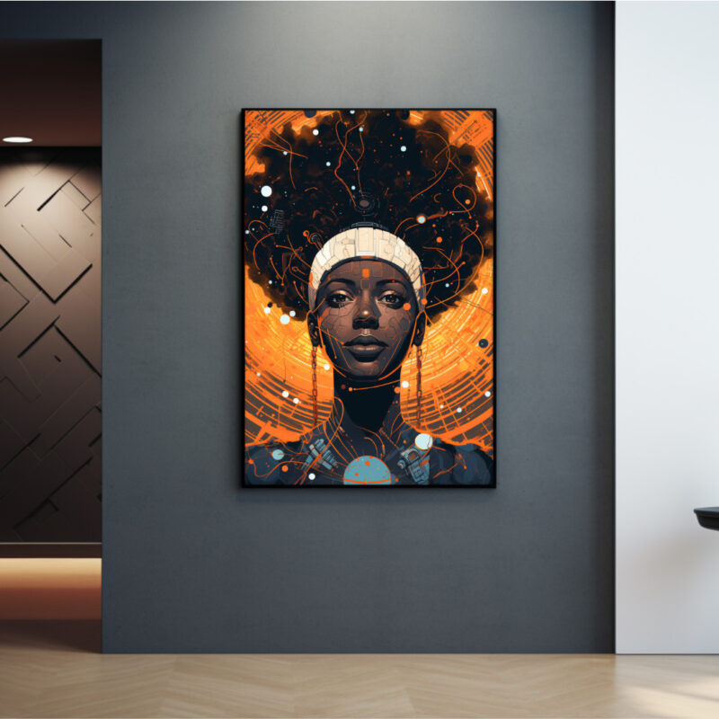 A glowing nexus of heritage and circuitry. “Cosmic Circuit” portrays a poised Black queen whose afro bursts into an orange-nebula lattice. Fine line-work and microchip details weave classic portraiture with futuristic energy, celebrating Afro-tech resilience.