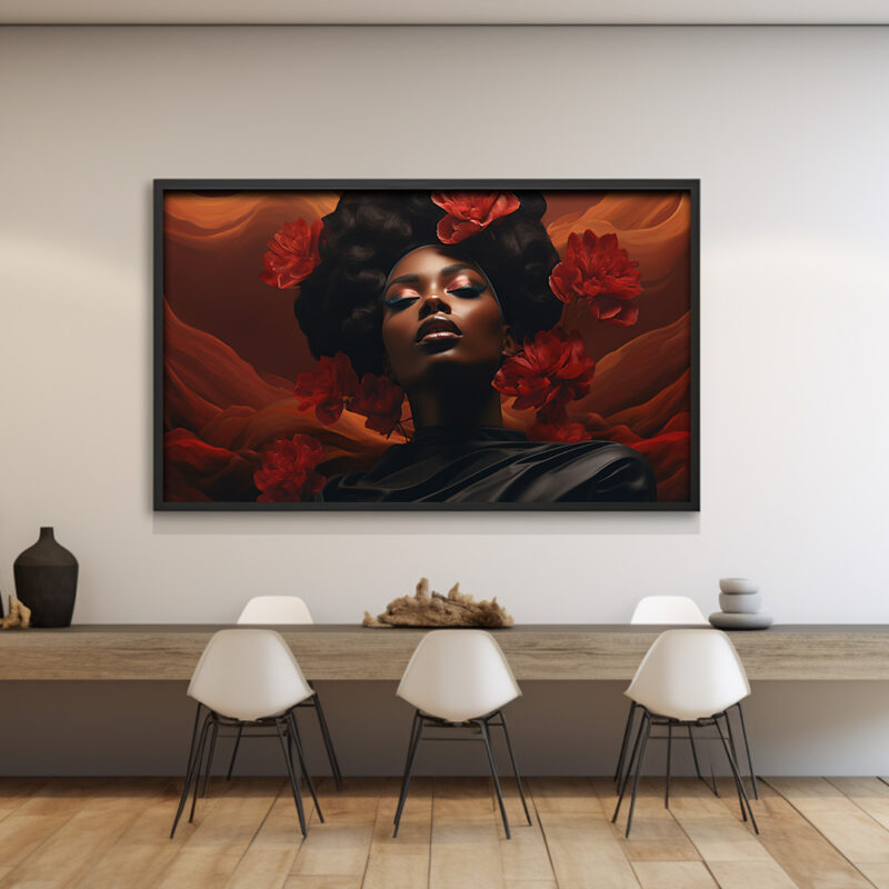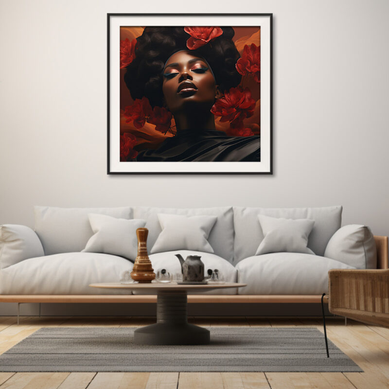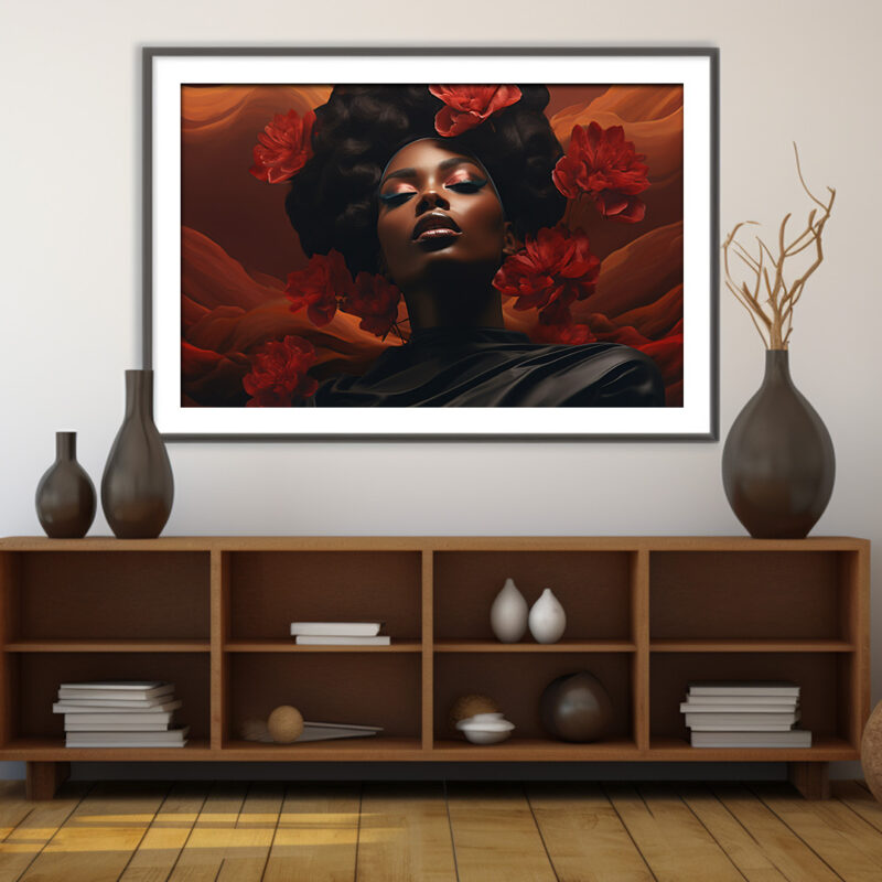 This piece of art celebrates Black excellence. It showcases a woman with a powerful presence, her eyes closed in a moment of serene confidence. Her hair is styled in an updo, and she is embellished with red flowers that add a touch of nature’s beauty to the composition. The background is a gradient of warm colors, creating a luxurious and inviting atmosphere. The art is an example of capturing the essence of elegance and strength.