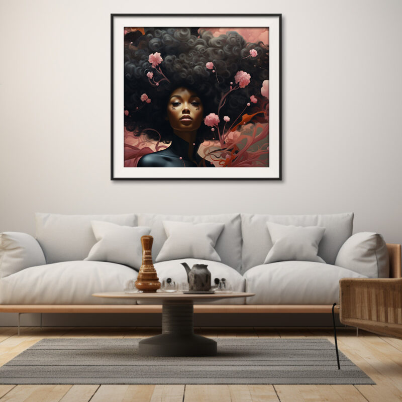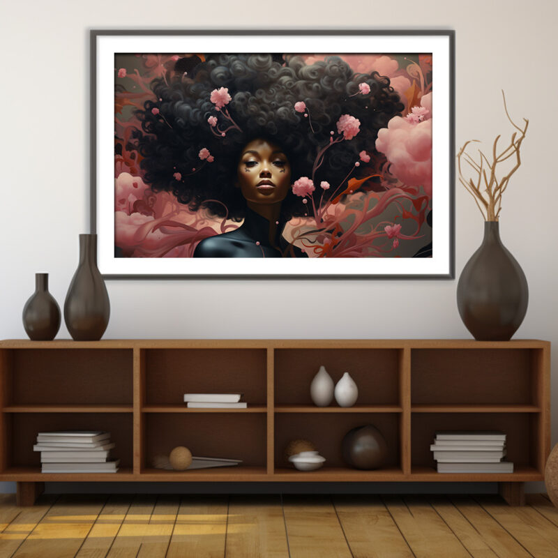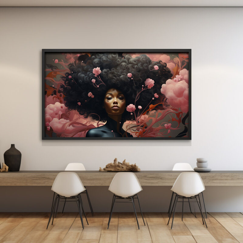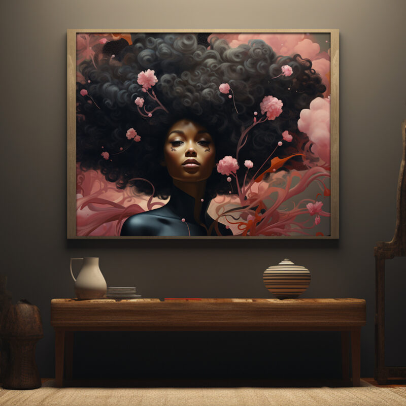 A digital artwork of a woman with a large, curly afro hairstyle. The woman’s face is in the center of the image, with her hair flowing around her. The background is a blend of pink and orange hues with abstract floral elements.