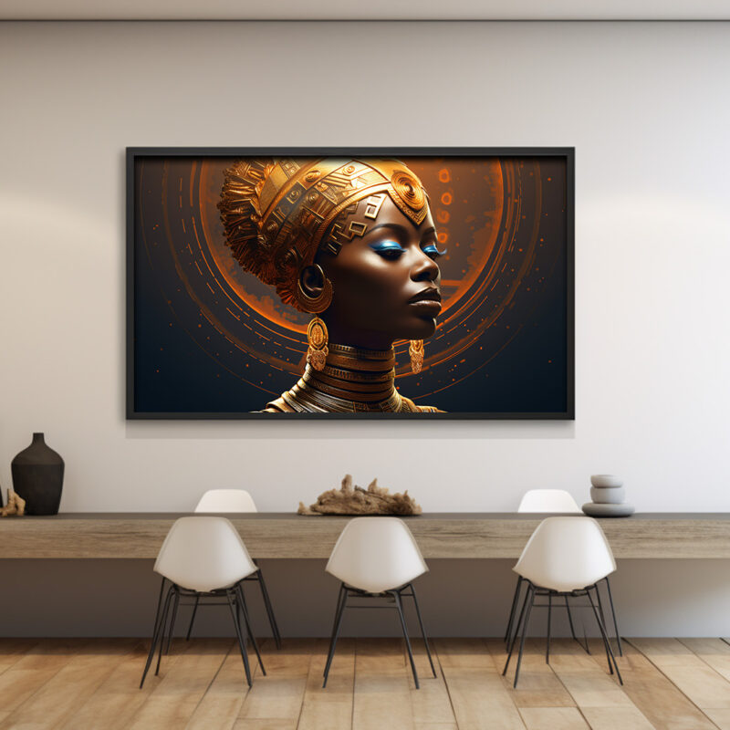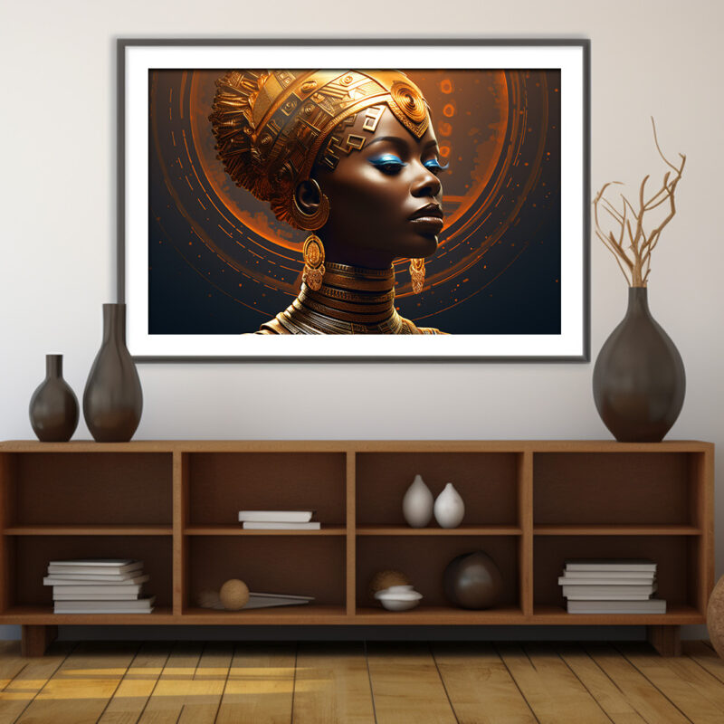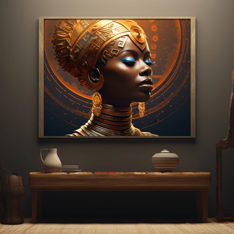 - Style: Warm metallic palette (gold and copper), tribal ornamentation, geometric overlays, and radiant Afro-textured silhouette