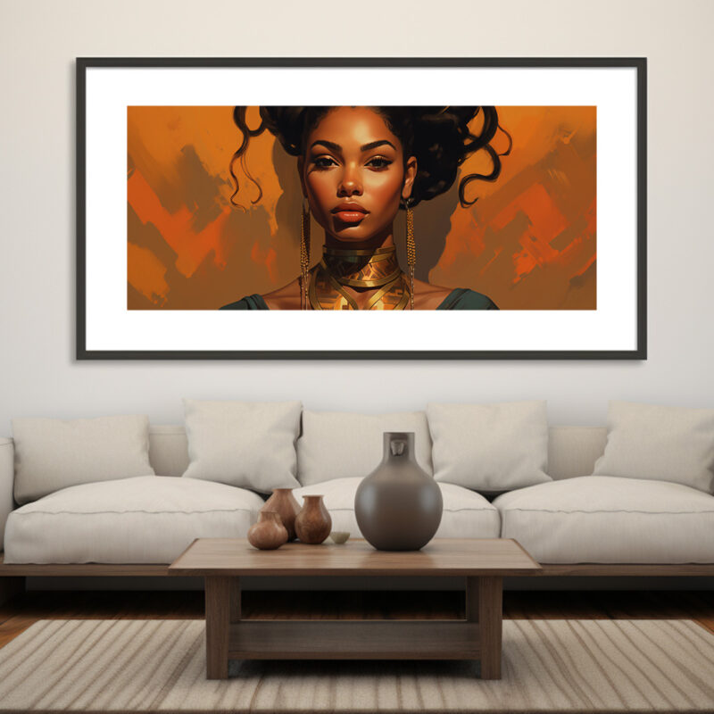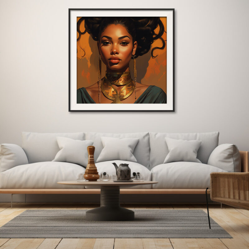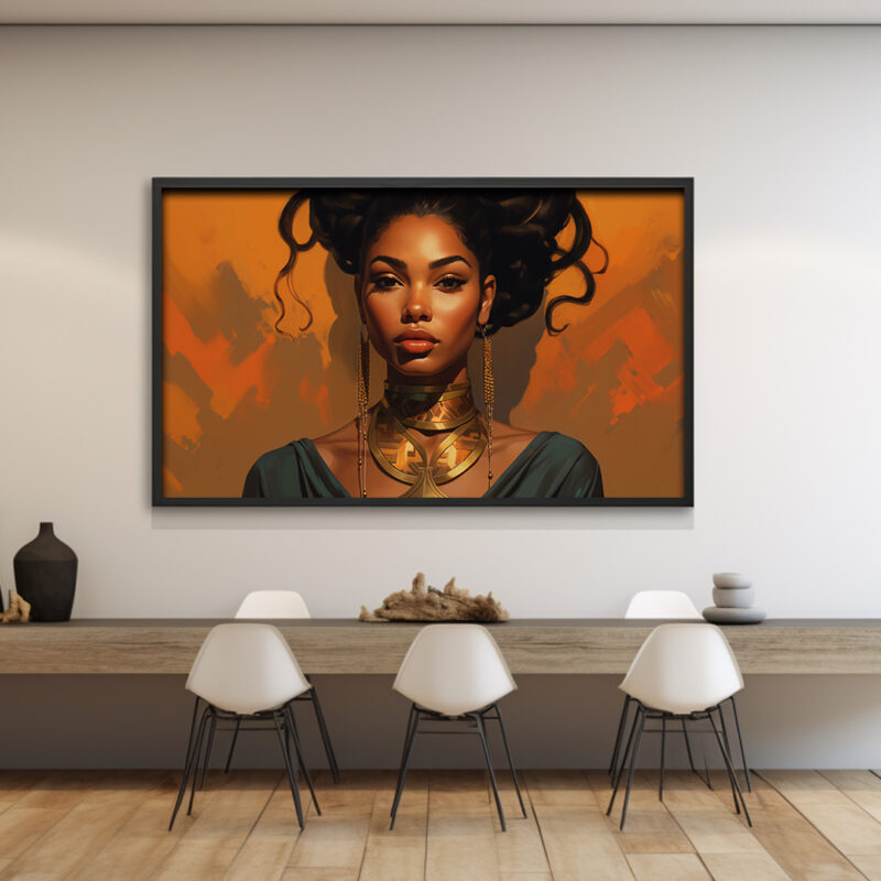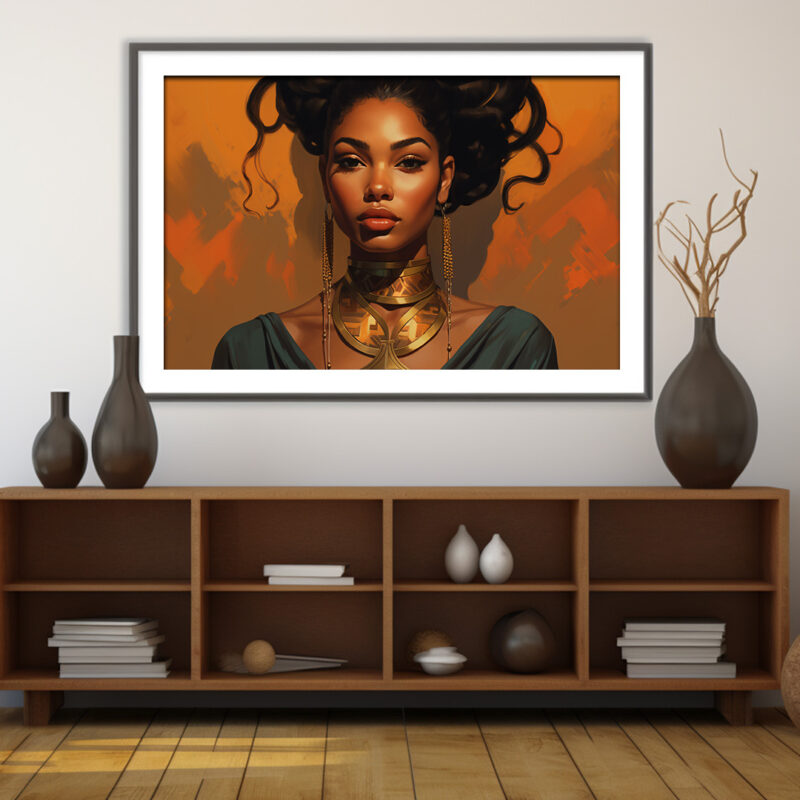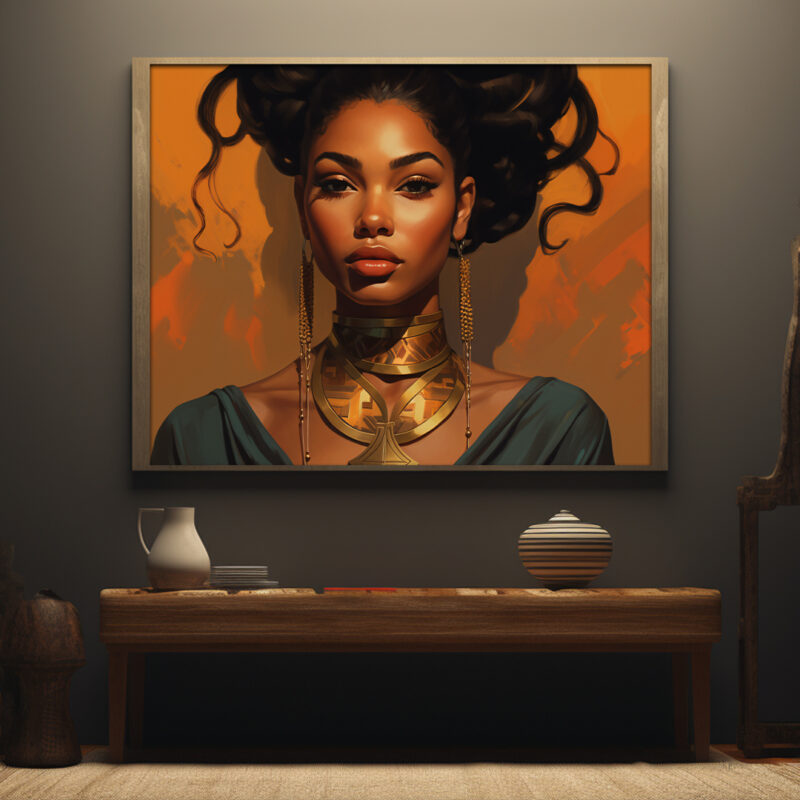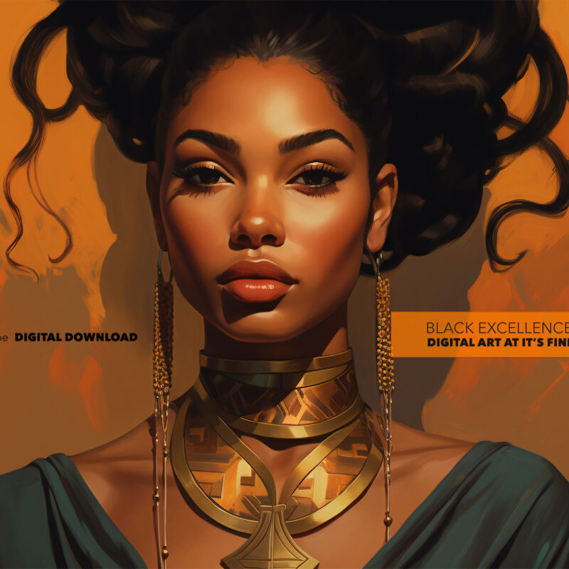 The background is a warm orange, providing a beautiful contrast to the woman’s skin tone and the gold of her necklace. The color palette is rich and inviting, making the image feel warm and welcoming. The artwork is a testament to the artist’s skill in digital art, with attention to detail that brings the image to life.