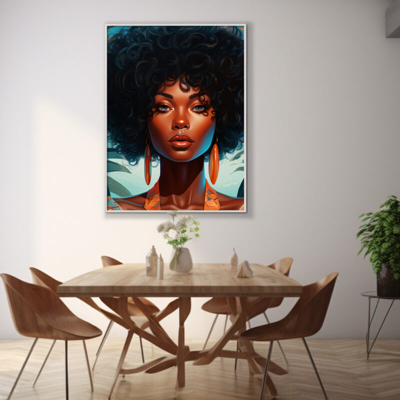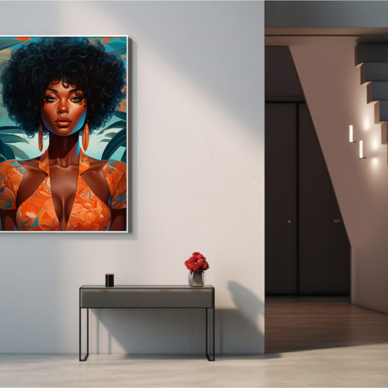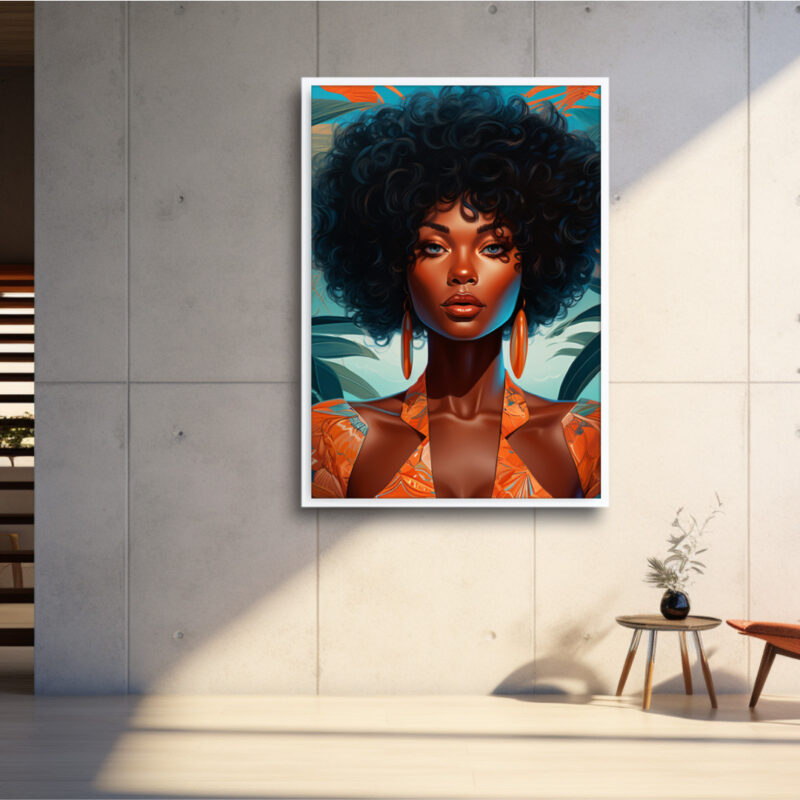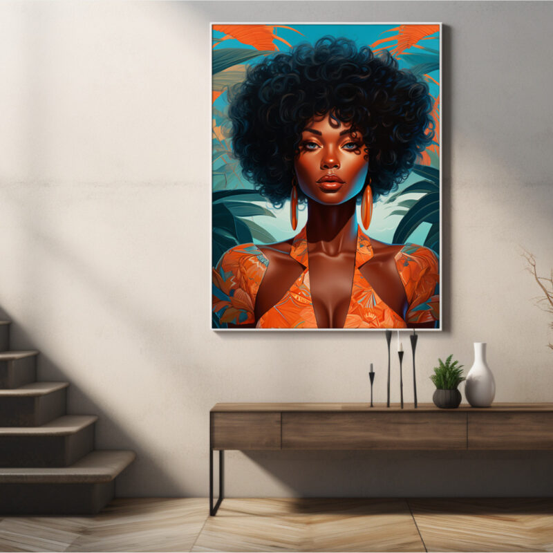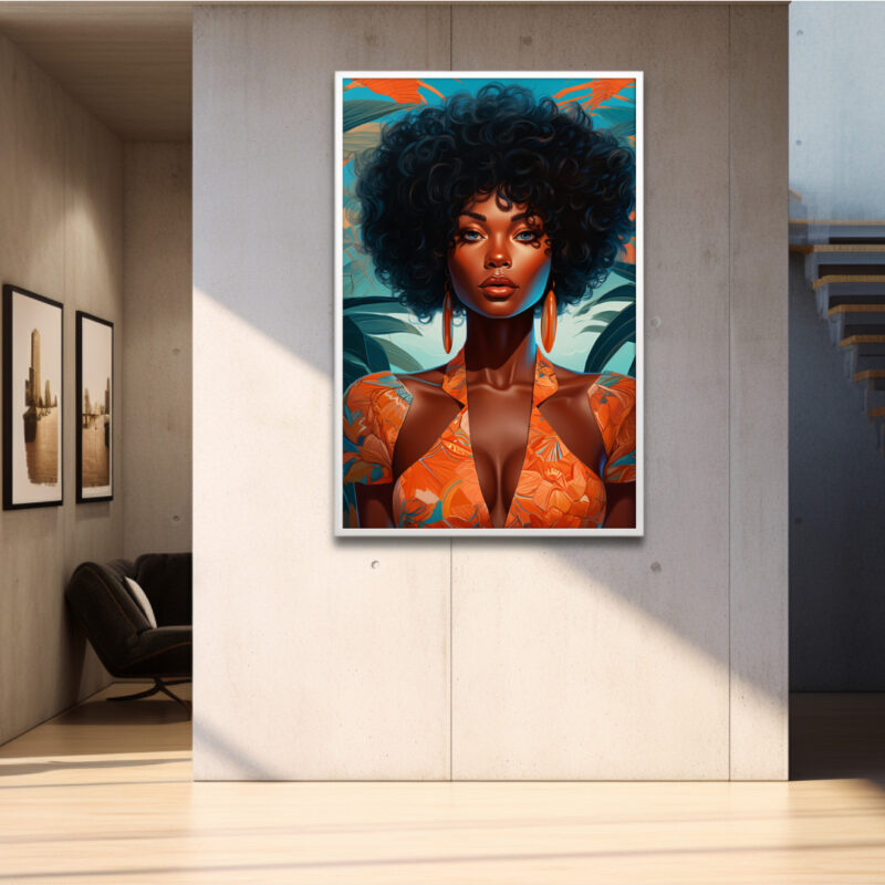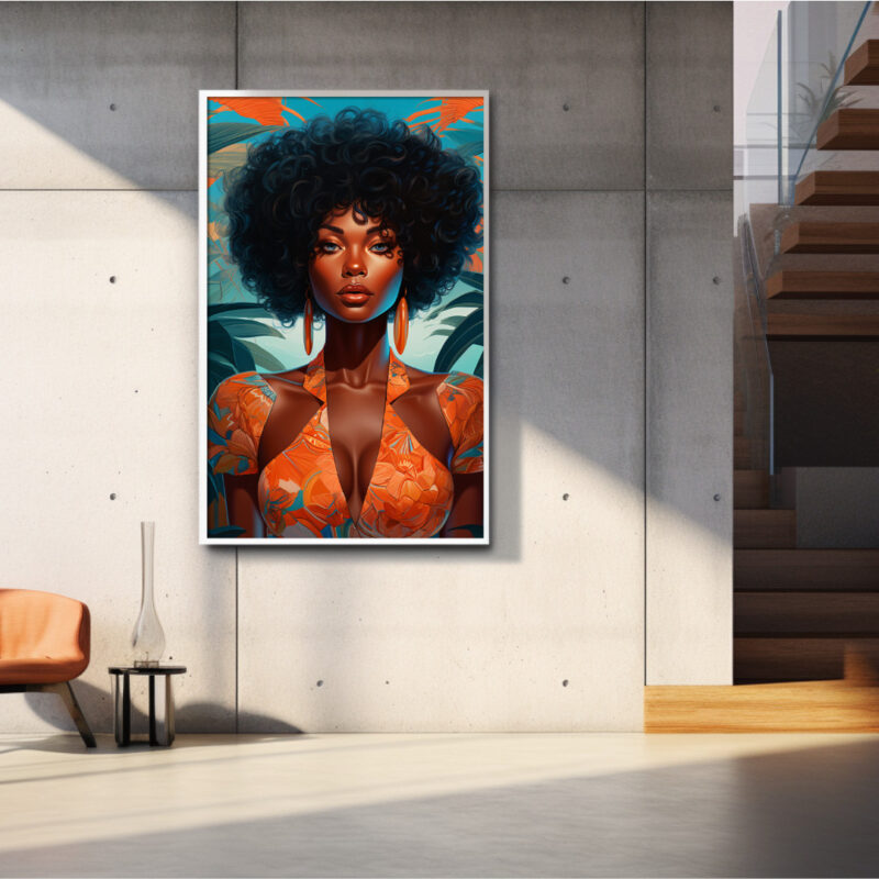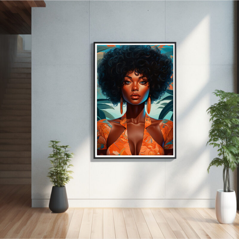 Feel the heat of a sun-drenched paradise. “Seductive Paradise” captures a confident Black muse bathed in lush corals, teals, and emerald foliage. Painterly highlights on her skin and lavish curls evoke wander-lust and empowerment in one iconic frame.