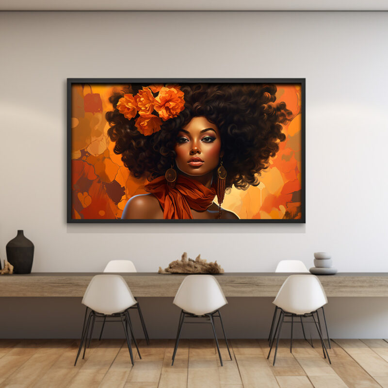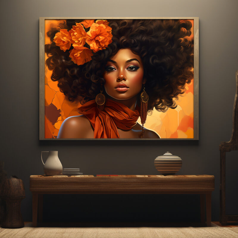 digital artwork showcasing a woman with an Afro hairstyle, wearing a vibrant orange flower in her hair and a red scarf around her neck. The background is a warm, abstract blend of orange and red tones, with splashes of yellow and hints of green.