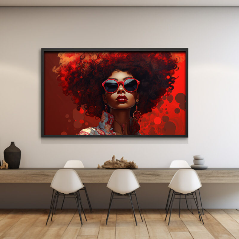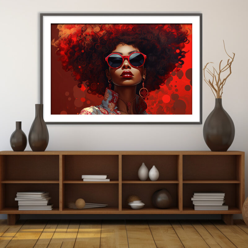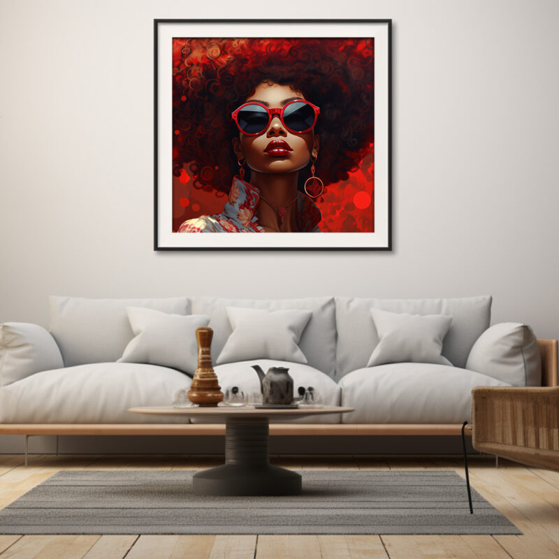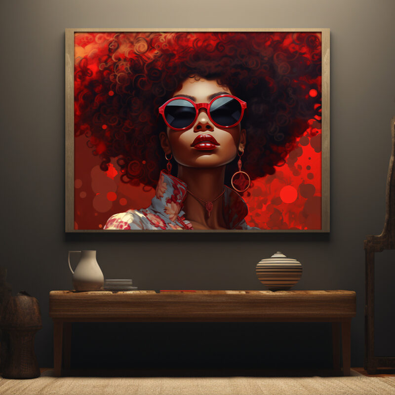 A portrait of a woman with striking red hair. She is wearing a pair of oversized, round sunglasses that give her an assertive and confident appearance. Her makeup is done in bold strokes, which adds to the overall edgy style. She’s also wearing large earrings that complement her vibrant hair. The woman is dressed in a patterned blouse with what appears to be floral or tropical motifs. In the background, there are abstract red and black shapes that might represent some form of artistic expression or simply part of the design aesthetic. The overall color palette is dominated by reds, which matches her hair and could imply a theme or a color-coordinated image.