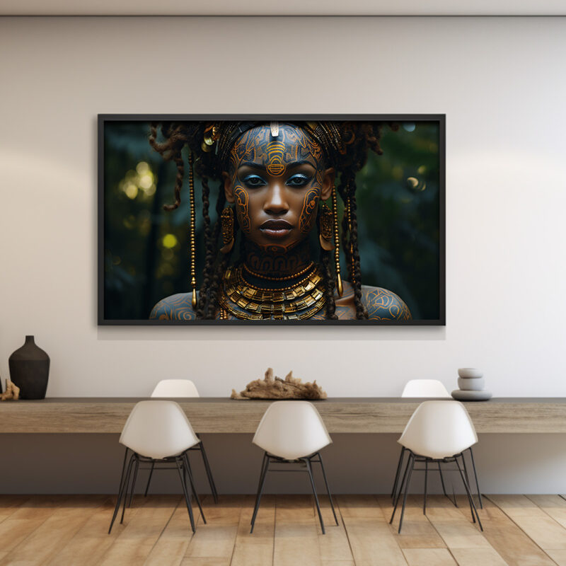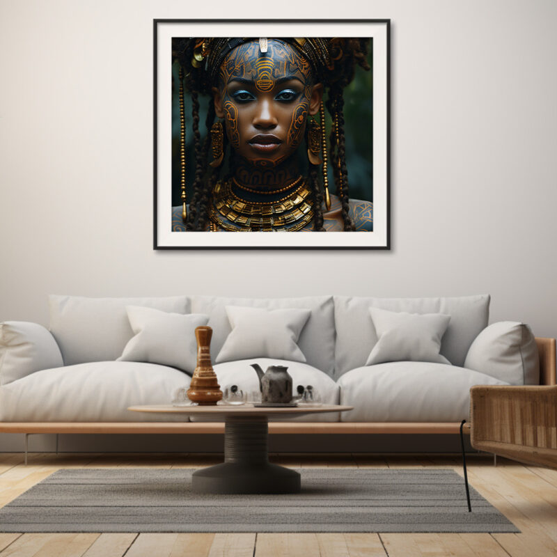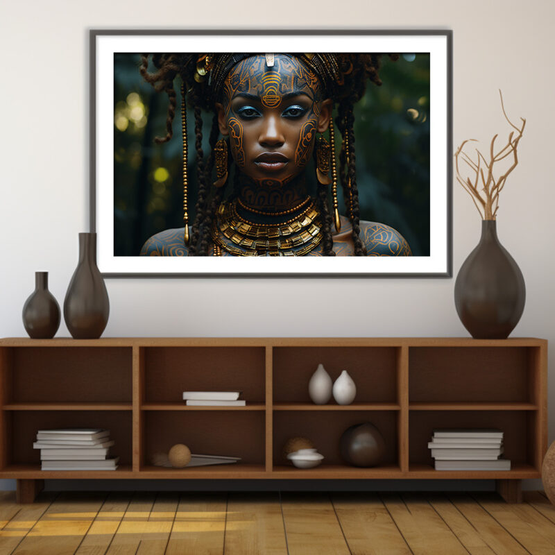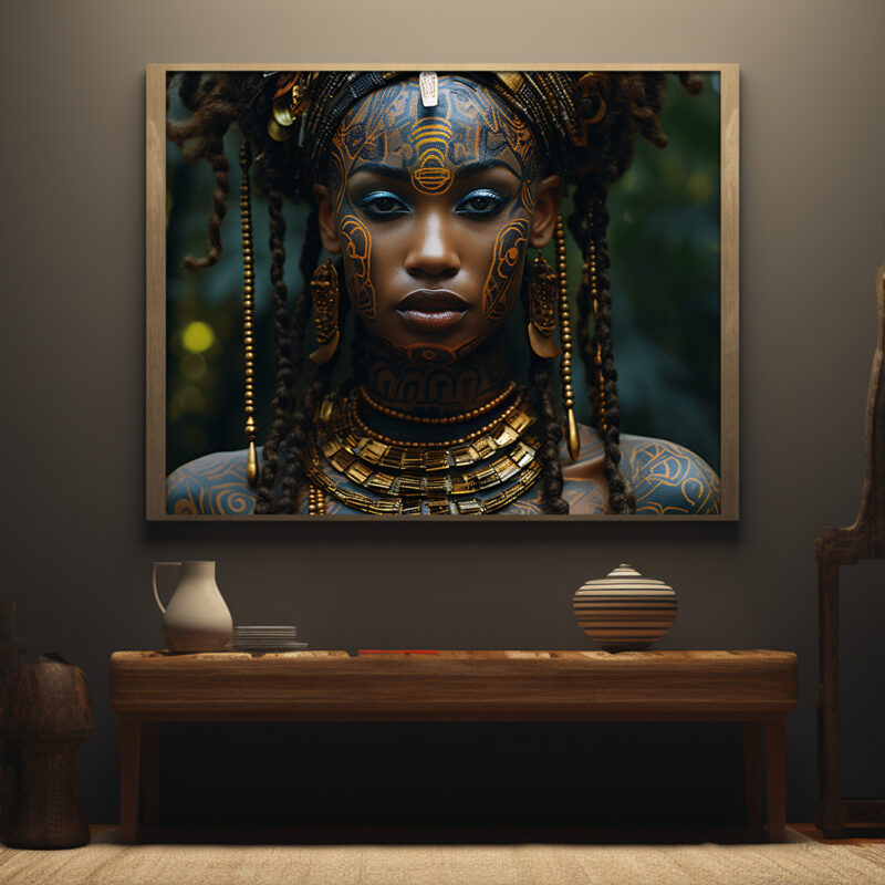 Experience the essence of Black excellence through this captivating digital art piece. At its heart is a woman adorned with tribal face paint, a powerful homage to the vibrant cultural heritage she embodies. Each stroke of the paint reveals intricate designs, a testament to the richness and complexity of tradition.